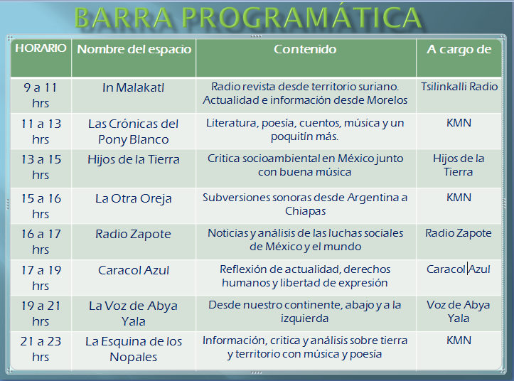 Comparte con nosotros éste circulo virtuoso de la comunicación y participa a través del feisbuk” o “tuiter” buscanos con los nombres de Tsilinkalli sonora, Pony blanco, Komanilel Hijos de la tierra, Radio zapote, Caracol azul, La Voz de Abya Yala.