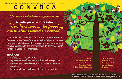 En punto de las nueve de la mañana, el moderador de la mesa, el compa Manuel, llamó a los presentes al encuentro “CON LA MEMORIA, LOS PUEBLOS CONSTRUIMOS JUSTICIA Y VERDAD” los días 16 y 17 de marzo, convocado por el Centro de Derechos Humanos fray Bartolomé de las Casas, con el fin de hacer conciencia sobre lo importante de hacer memoria de las luchas de los pueblos en resistencia.