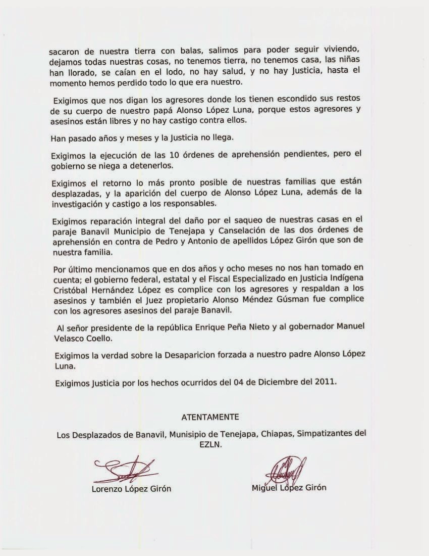 A dos años y ocho meses de su desplazamiento forzado, familias de Banavil continúan en búsqueda de justicia. Acusan que los gobiernos estatal y federal, el Fiscal Especializado en Justicia Indígena Cristóbal Hernández López y el Juez propietario Alonso Méndez Gúzman, son cómplices con los agresores. Exigen: aparición del cuerpo de Alonso López Luna; ejecusión de 10 órdenes de aprehensión pendientes; investigación y castigo a los responsables de la agresión; retorno de las familias desplazadas forzadamente; reparación integral del daño por el saqueo de casas en el paraje Banavil; cancelación de órdenes de aprehensión contra Pedro y Antonio López Girón.